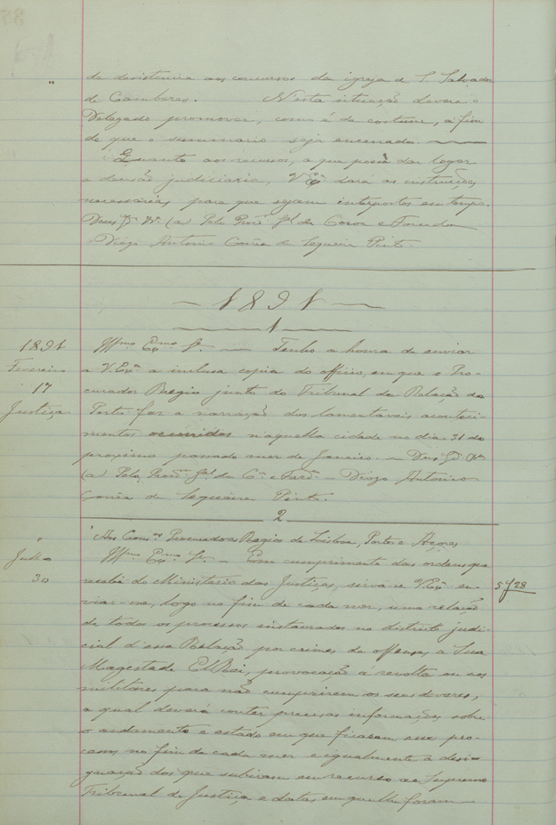 - Ofício do Procurador-Geral da Coroa e Fazenda, Diogo António Correia de Sequeira Pinto, dirigido ao Ministro da Justiça, em que o informa sobre a inexistência de processos instaurados por abuso de liberdade de imprensa, na maior parte do distrito judicial da Relação do Porto, no mês de outubro. Participa igualmente que naquela data, não recebera ainda as informações mensais dos delegados nos tribunais auxiliares daquela comarca e nas de Arganil e Meda, e que o da Régua havia requerido procedimento contra José da Rede, e outros, da freguesia do Loureiro, por ofensas verbais ao Rei (21 de janeiro de 1892)