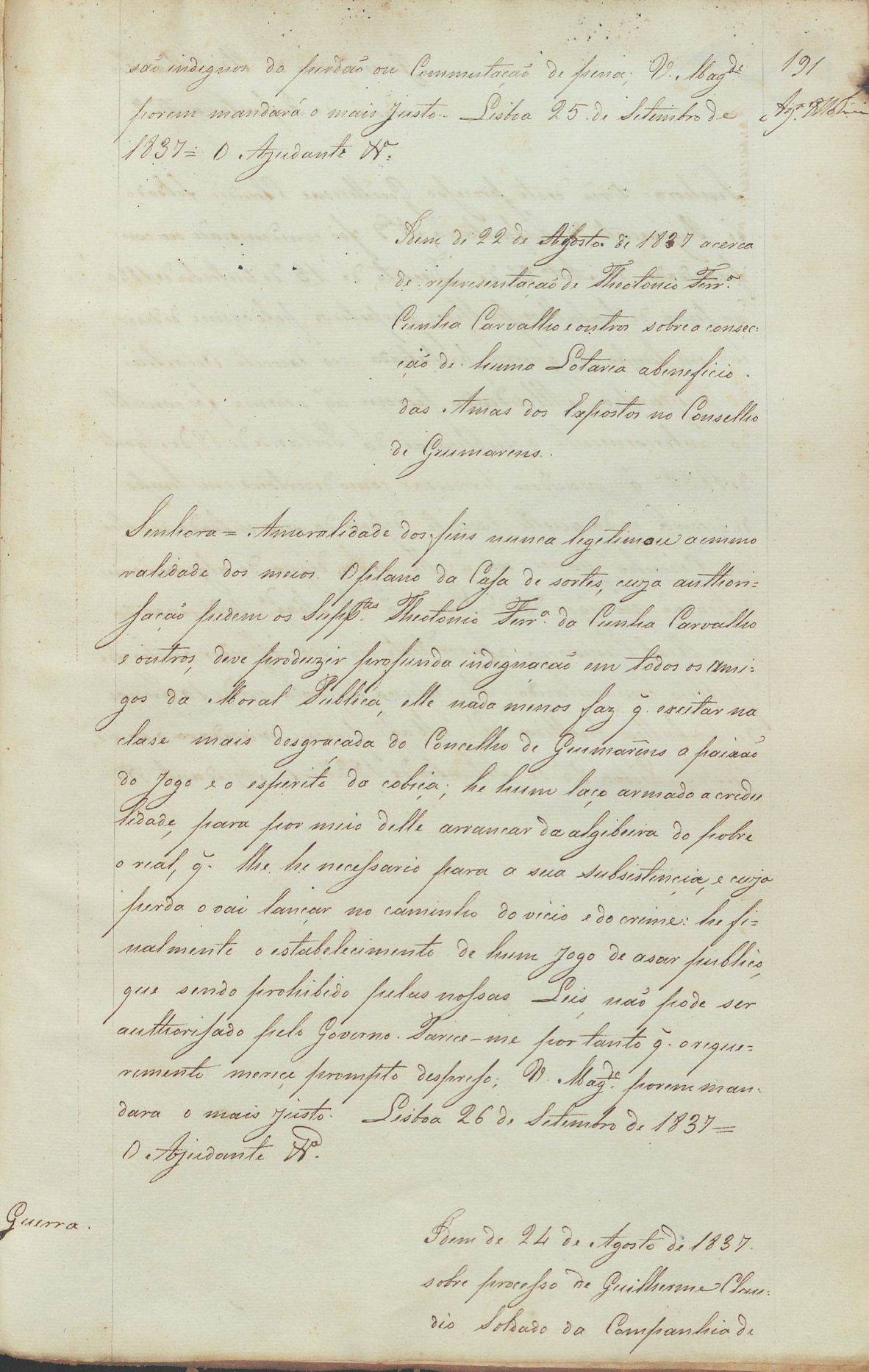 No mesmo ano, Teotónio Ferreira de Cunha Carvalho e outros solicitam ao Governo autorização para a concessão de uma lotaria, no concelho de Guimarães, para “benefício das amas dos expostos”. O mesmo magistrado, a 26 de setembro, dá um parecer desfavorável, salientando que “a moralidade dos fins nunca legitimou a imoralidade dos meios”.